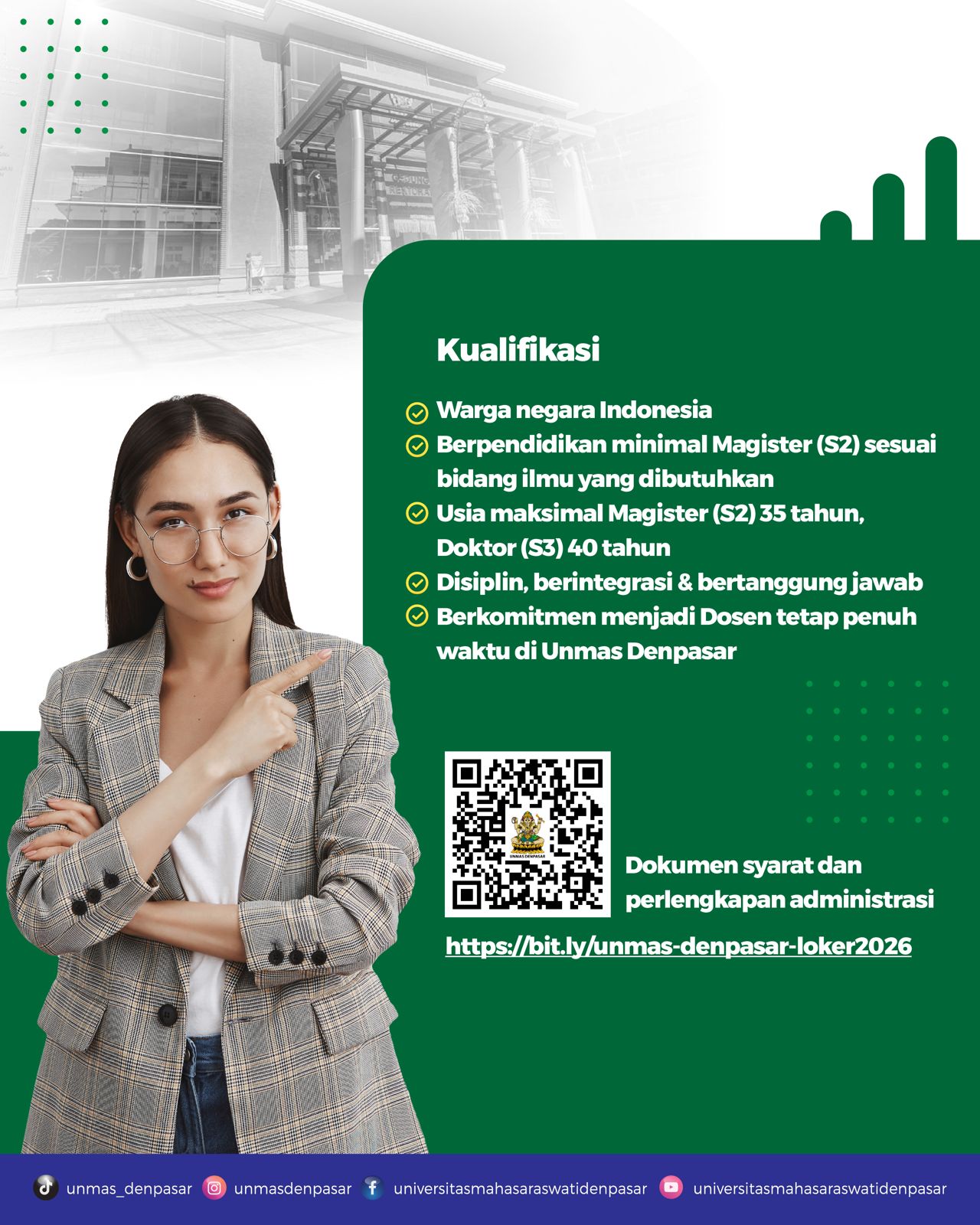 Universitas Mahasaraswati (Unmas) Denpasar kembali membuka kesempatan bagi putra-putri terbaik bangsa untuk bergabung sebagai Tenaga Pendidik (Dosen Tetap) Tahun 2026. Rekrutmen ini merupakan bagian dari komitmen Unmas Denpasar dalam memperkuat kualitas akademik dan pengembangan sumber daya manusia yang unggul.
