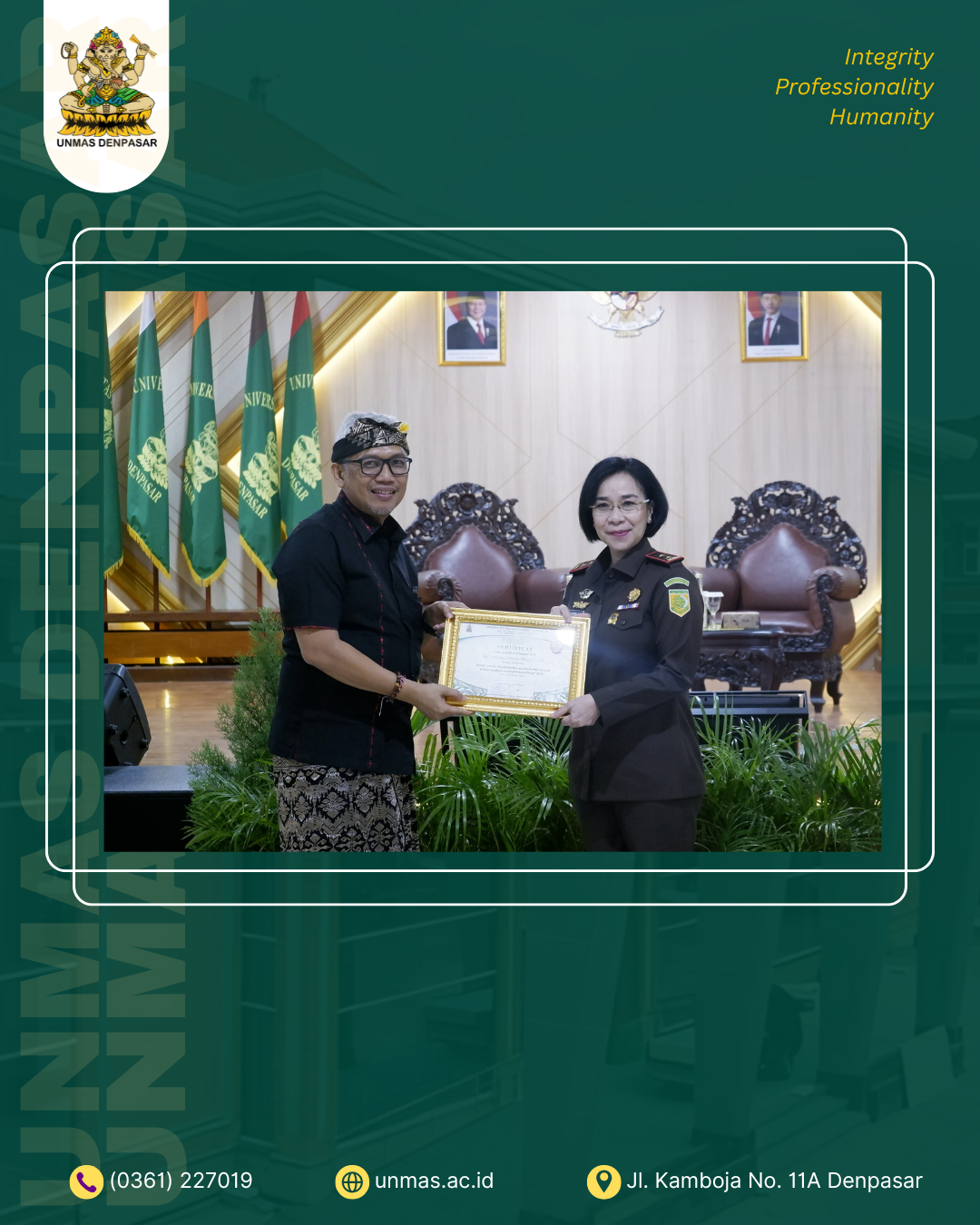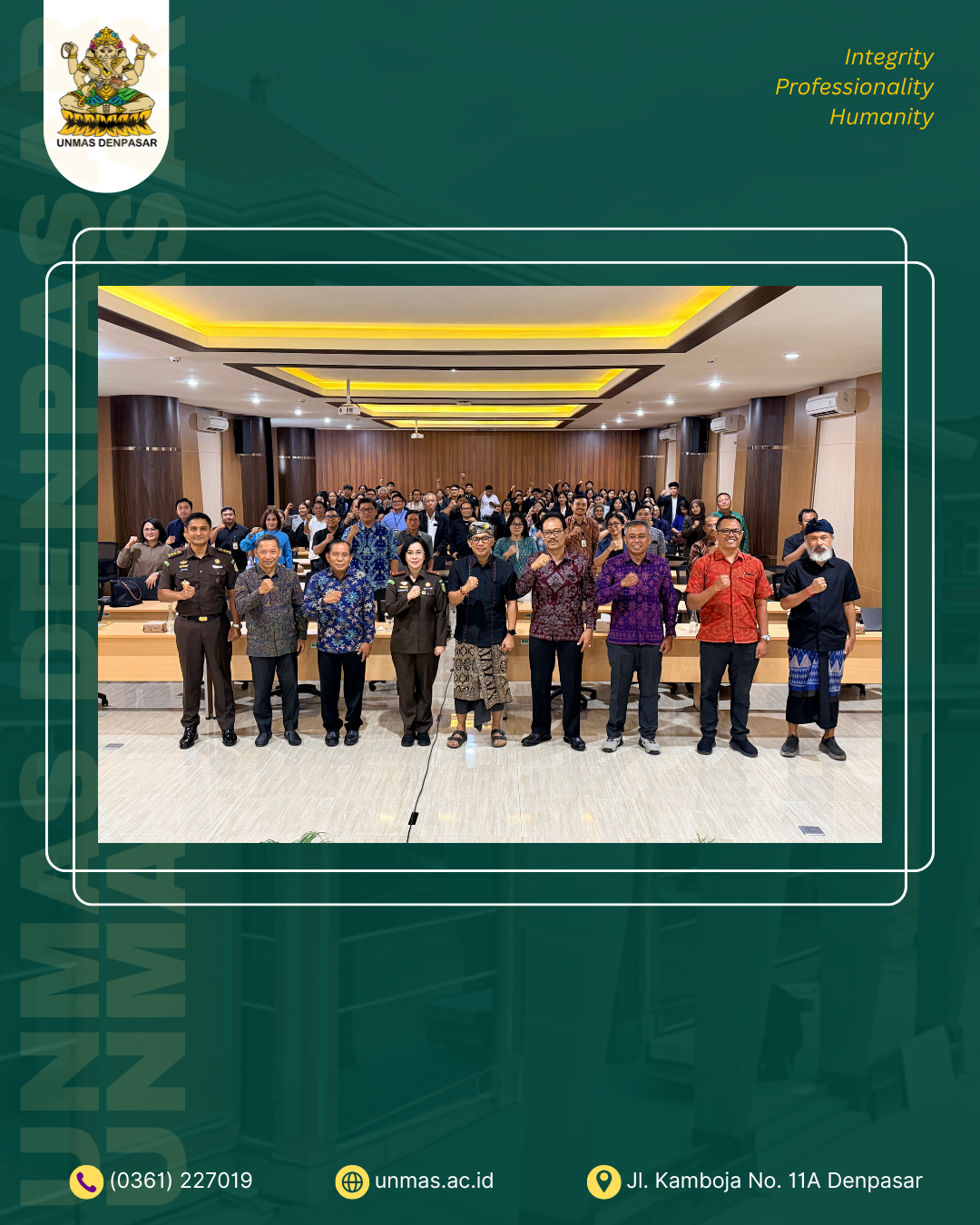 Kuliah umum diawali dengan sambutan sekaligus pembukaan resmi oleh Rektor Universitas Mahasaraswati Denpasar, Prof. Dr. Sukawati Lanang P. Perbawa, S.H., M.H. Selanjutnya, kegiatan dipandu oleh Dr. Ir. Yogi Yasa Wedha, S.H., M.H., M.M. sebagai moderator, dengan menghadirkan Dr. Chatarina Muliana, S.H., S.E., M.H., Kepala Kejaksaan Tinggi Bali, sebagai narasumber utama.